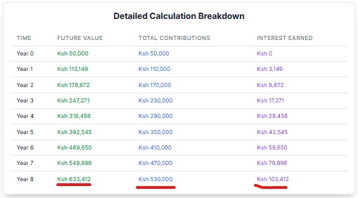 A professional invests KSh 50,000 in a money market fund with KSh 5,000 monthly contributions, earning 4% per year, compounded monthly, for 8 years.