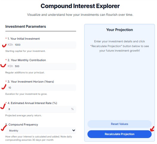 Once you click Recalculate Projection, you see how your investment compounds over time. The projection updates instantly, helping you test multiple strategies.