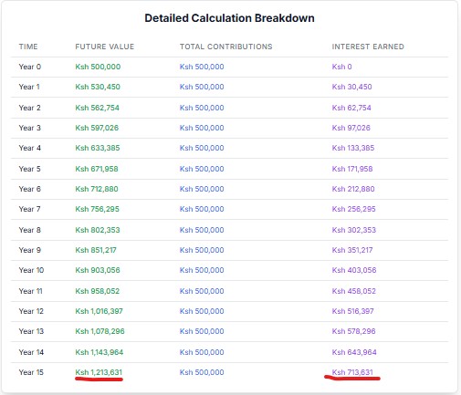 A conservative investor buys KSh 500,000 in long-term bonds, reinvesting coupon payments at a 6% annual rate, compounded semiannually, over 15 years.