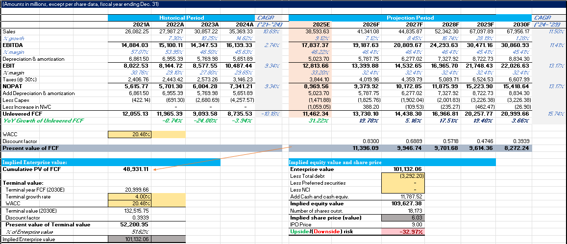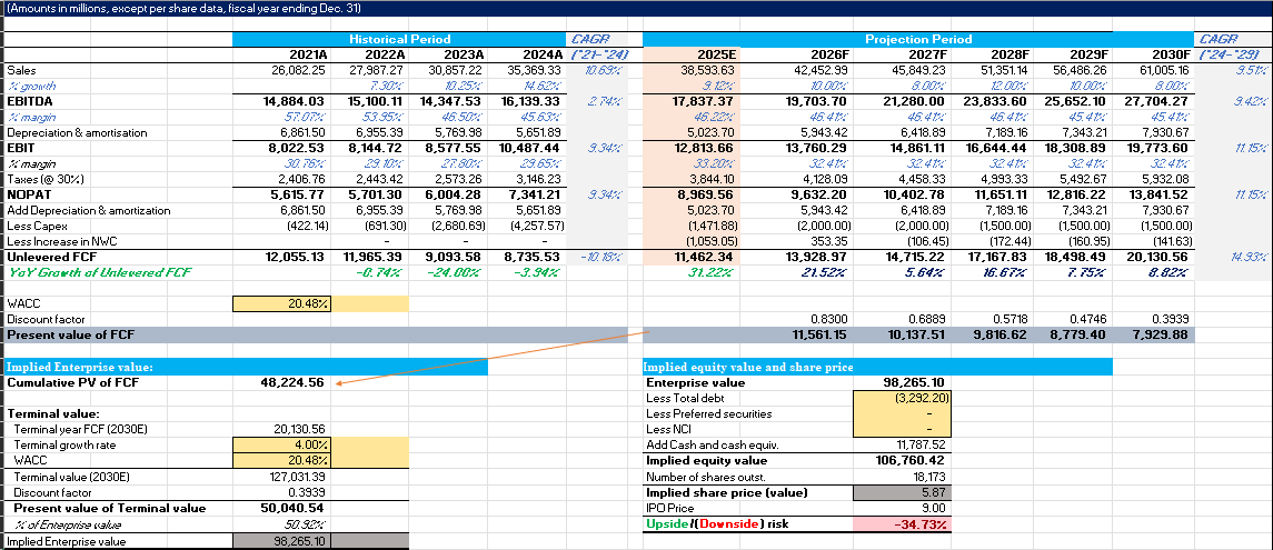 Even granting management’s growth narrative, the IPO price still leads cash-flow realisation, implying a valuation premium.