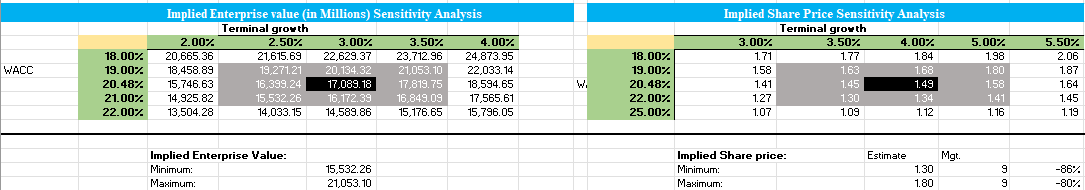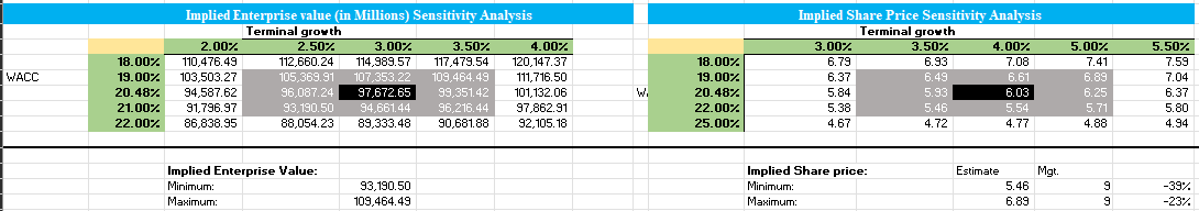 - Implied equity value per share range: ~KSh 5.46–6.89